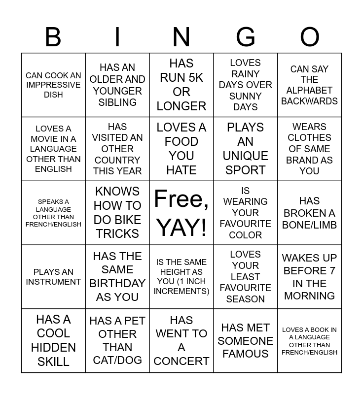 This bingo card has a free space and 24 words: HAS THE SAME BIRTHDAY AS YOU, HAS A PET OTHER THAN CAT/DOG, LOVES A FOOD YOU HATE, HAS A COOL HIDDEN SKILL, CAN SAY THE ALPHABET BACKWARDS, CAN COOK AN IMPPRESSIVE DISH, LOVES A MOVIE IN A LANGUAGE OTHER THAN ENGLISH, HAS AN OLDER AND YOUNGER SIBLING, IS WEARING YOUR FAVOURITE COLOR, IS THE SAME HEIGHT AS YOU (1 INCH INCREMENTS), PLAYS AN UNIQUE SPORT, SPEAKS A LANGUAGE OTHER THAN FRENCH/ENGLISH, LOVES YOUR LEAST FAVOURITE SEASON, WAKES UP BEFORE 7 IN THE MORNING, HAS VISITED AN OTHER COUNTRY THIS YEAR, HAS MET SOMEONE FAMOUS, HAS BROKEN A BONE/LIMB, HAS RUN 5K OR LONGER, WEARS CLOTHES OF SAME BRAND AS YOU, KNOWS HOW TO DO BIKE TRICKS, LOVES A BOOK IN A LANGUAGE OTHER THAN FRENCH/ENGLISH, PLAYS AN INSTRUMENT, LOVES RAINY DAYS OVER SUNNY DAYS and HAS WENT TO A CONCERT.