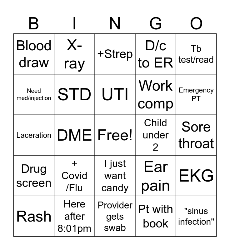 This bingo card has a free space and 24 words: + Covid /Flu, Here after 8:01pm, UTI, Rash, Tb test/read, Blood draw, Need med/injection, X-ray, Child under 2, I just want candy, Work comp, Laceration, Ear pain, EKG, STD, Pt with book, Sore throat, +Strep, Emergency PT, DME, "sinus infection", Drug screen, D/c to ER and Provider gets swab.