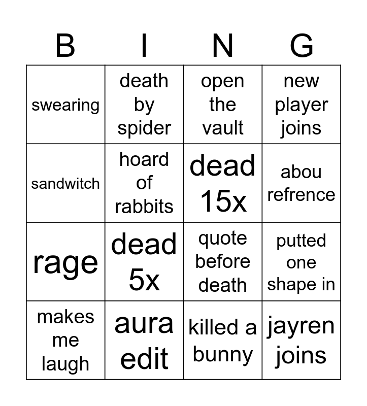 This bingo card has 16 words: aura edit, putted one shape in, open the vault, swearing, rage, death by spider, quote before death, killed a bunny, sandwitch, hoard of rabbits, makes me laugh, new player joins, dead 5x, abou refrence, dead 15x and jayren joins.