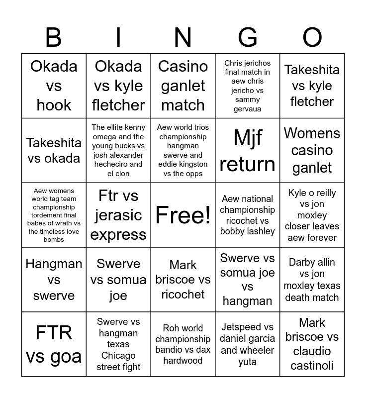 This bingo card has a free space and 24 words: Swerve vs somua joe, Swerve vs hangman texas Chicago street fight, Aew world trios championship hangman swerve and eddie kingston vs the opps, FTR vs goa, Takeshita vs kyle fletcher, Okada vs hook, Takeshita vs okada, Okada vs kyle fletcher, Aew national championship ricochet vs bobby lashley, Mark briscoe vs ricochet, Mjf return, Aew womens world tag team championship tordement final babes of wrath vs the timeless love bombs, Swerve vs somua joe vs hangman, Darby allin vs jon moxley texas death match, The ellite kenny omega and the young bucks vs josh alexander hecheciro and el clon, Jetspeed vs daniel garcia and wheeler yuta, Kyle o reilly vs jon moxley closer leaves aew forever, Casino ganlet match, Womens casino ganlet, Ftr vs jerasic express, Mark briscoe vs claudio castinoli, Hangman vs swerve, Chris jerichos final match in aew chris jericho vs sammy gervaua and Roh world championship bandio vs dax hardwood.