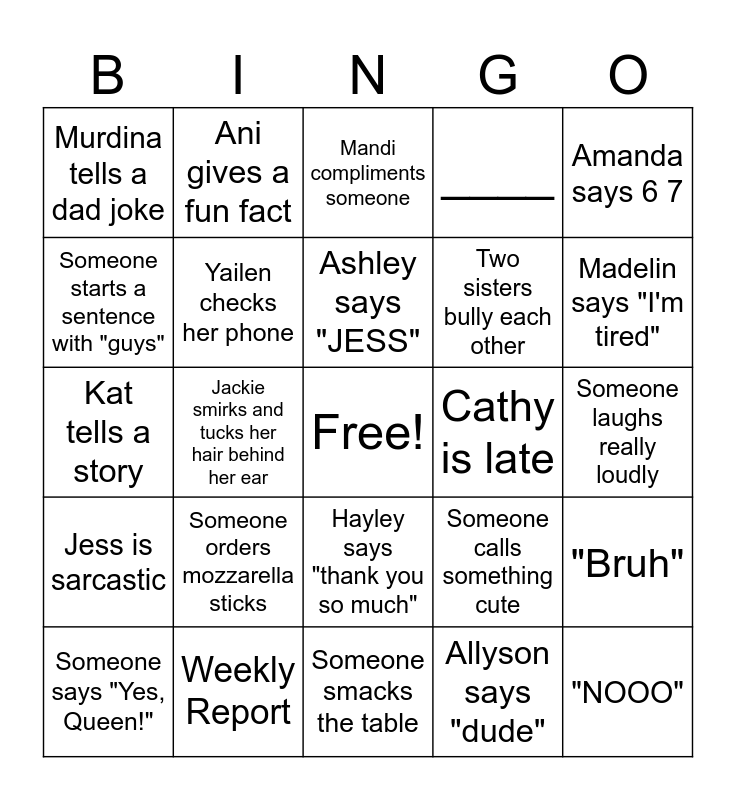 This bingo card has a free space and 24 words: Someone orders mozzarella sticks, Weekly Report, Ashley says "JESS", Someone says "Yes, Queen!", Amanda says 6 7, Murdina tells a dad joke, Someone starts a sentence with "guys", Ani gives a fun fact, Cathy is late, Hayley says "thank you so much", Two sisters bully each other, Kat tells a story, Someone calls something cute, "Bruh", Yailen checks her phone, Allyson says "dude", Someone laughs really loudly, Mandi compliments someone, Madelin says "I'm tired", Jackie smirks and tucks her hair behind her ear, "NOOO", Jess is sarcastic, ____ and Someone smacks the table.