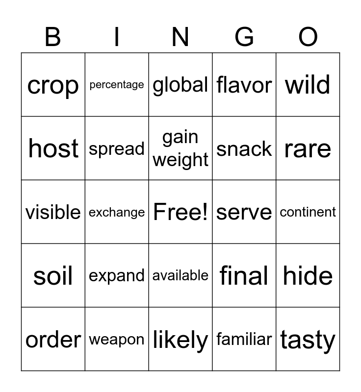 This bingo card has a free space and 24 words: expand, weapon, gain weight, order, wild, crop, host, percentage, serve, available, snack, visible, final, hide, spread, familiar, continent, global, rare, exchange, tasty, soil, flavor and likely.
