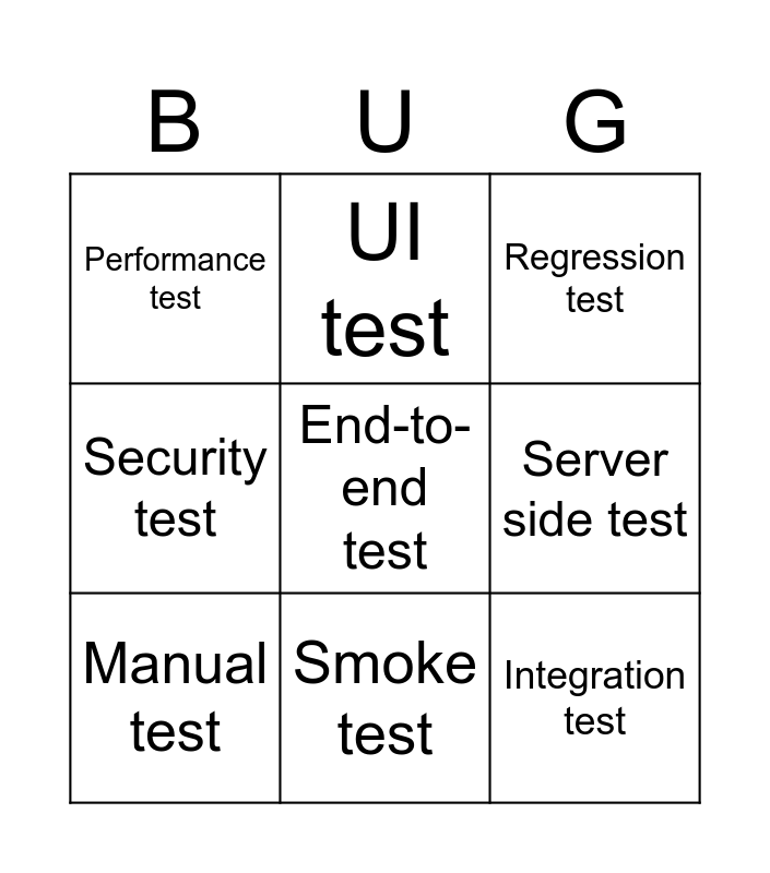 This bingo card has 12 words: Unit test, Integration test, End-to-end test, Server side test, UI test, Regression test, Smoke test, Compatibility test, Performance test, Security test, Manual test and Automated test.