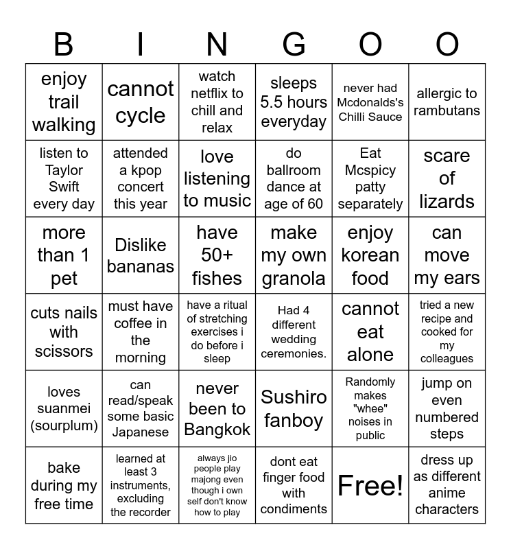 This bingo card has 42 words: Free!, attended a kpop concert this year, attended a kpop concert overseas this year, enjoy korean food, tried a new recipe and cooked for my colleagues, must have coffee in the morning, more than 1 pet, have 1 or more blind box item on my work desk or at home, watch netflix to chill and relax, can move my ears, have 50+ fishes, do ballroom dance at age of 60, scare of lizards, never had Mcdonalds's Chilli Sauce, learned at least 3 instruments, excluding the recorder, cuts nails with scissors, jump on even numbered steps, Eat Mcspicy patty separately, dress up as different anime characters, cannot cycle, allergic to rambutans, never been to Bangkok, loves suanmei (sourplum), enjoy trail walking, brew my own tea, bake during my free time, love listening to music, used to watch over 100 films a year, can read/speak some basic Japanese, Randomly makes "whee" noises in public, worked so hard my lung popped, make my own granola, listen to Taylor Swift every day, cannot eat alone, always jio people play majong even though i own self don't know how to play, have a ritual of stretching exercises i do before i sleep, Had 4 different wedding ceremonies., Dislike bananas, Sushiro fanboy, dont eat finger food with condiments, sleeps 5.5 hours everyday and had 8 dogs in his life.