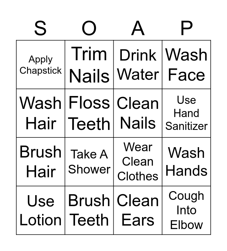This bingo card has 16 words: Brush Teeth, Wash Hands, Drink Water, Apply Chapstick, Brush Hair, Trim Nails, Wear Clean Clothes, Clean Ears, Wash Hair, Floss Teeth, Use Lotion, Wash Face, Take A Shower, Use Hand Sanitizer, Clean Nails and Cough Into Elbow.