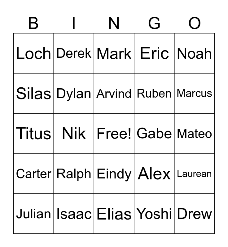 This bingo card has a free space and 24 words: Ralph, Isaac, Arvind, Julian, Noah, Loch, Silas, Derek, Gabe, Eindy, Ruben, Titus, Alex, Laurean, Dylan, Yoshi, Mateo, Mark, Marcus, Nik, Drew, Carter, Eric and Elias.