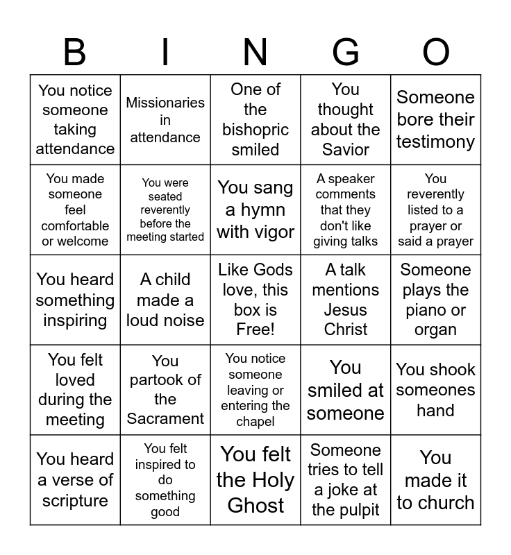 This bingo card has a free space and 24 words: You partook of the Sacrament, You felt inspired to do something good, You sang a hymn with vigor, You heard a verse of scripture, Someone bore their testimony, You notice someone taking attendance, You made someone feel comfortable or welcome, Missionaries in attendance, A talk mentions Jesus Christ, You notice someone leaving or entering the chapel, A speaker comments that they don't like giving talks, You heard something inspiring, You smiled at someone, You shook someones hand, You were seated reverently before the meeting started, Someone tries to tell a joke at the pulpit, Someone plays the piano or organ, One of the bishopric smiled, You reverently listed to a prayer or said a prayer, A child made a loud noise, You made it to church, You felt loved during the meeting, You thought about the Savior and You felt the Holy Ghost.