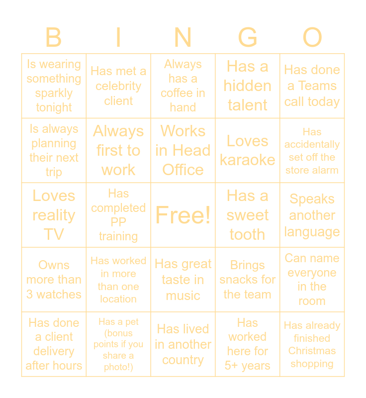 This bingo card has a free space and 32 words: Has worked here for 5+ years, Knows everyone’s coffee order, Has completed PP training, Travels the furthest to work, Owns more than 3 watches, Always first to work, Has done a Teams call today, Can name everyone in the room, Has met a celebrity client, Joined the company this year, Works in Head Office, Always has a coffee in hand, Brings lunch from home, Is the most competitive, Has a sweet tooth, Is always at the gym, Has done a client delivery after hours, Loves reality TV, Has great taste in music, Has worked in more than one location, Brings snacks for the team, Has travelled overseas this year, Speaks another language, Has a pet (bonus points if you share a photo!), Has already finished Christmas shopping, Has a hidden talent, Loves karaoke, Is always planning their next trip, Is wearing something sparkly tonight, Has lived in another country, Can’t survive without their phone and Has accidentally set off the store alarm.