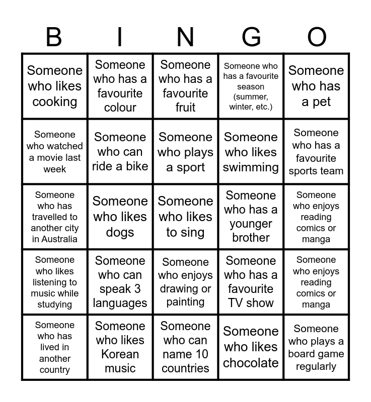 This bingo card has a free space and 24 words: Someone who can speak 3 languages, Someone who likes Korean music, Someone who plays a sport, Someone who has lived in another country, Someone who has a pet, Someone who likes cooking, Someone who watched a movie last week, Someone who has a favourite colour, Someone who has a younger brother, Someone who enjoys drawing or painting, Someone who likes swimming, Someone who has travelled to another city in Australia, Someone who has a favourite TV show, Someone who enjoys reading comics or manga, Someone who can ride a bike, Someone who likes chocolate, Someone who enjoys reading comics or manga, Someone who has a favourite fruit, Someone who has a favourite sports team, Someone who likes dogs, Someone who plays a board game regularly, Someone who likes listening to music while studying, Someone who has a favourite season (summer, winter, etc.) and Someone who can name 10 countries.