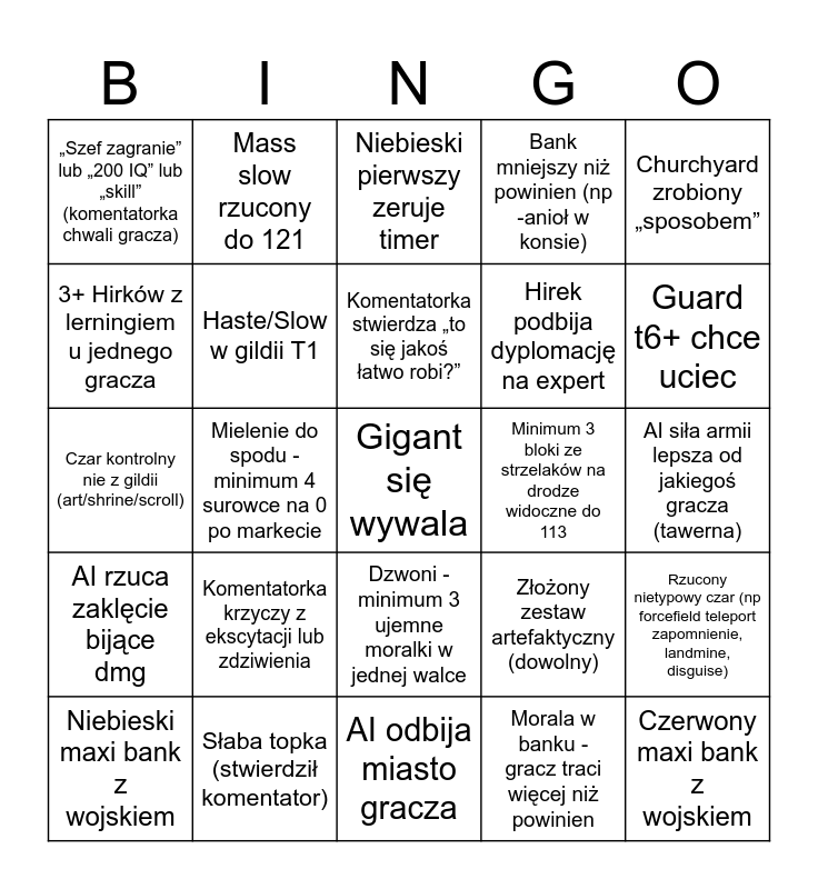 This bingo card has a free space and 43 words: T6+ z kebaba, Czerwony maxi bank z wojskiem, Czerwony mini bank z wojskiem, Niebieski maxi bank z wojskiem, Niebieski mini bank z wojskiem, Morala w banku - gracz traci więcej niż powinien, Niebieski pierwszy zeruje timer, Czerwony pierwszy zeruje timer, Churchyard zrobiony „sposobem”, Słaba topka (stwierdził komentator), Bank mniejszy niż powinien (np -anioł w konsie), Minimum 3 bloki ze strzelaków na drodze widoczne do 113, Dzwoni - minimum 3 ujemne moralki w jednej walce, Komentatorka krzyczy z ekscytacji lub zdziwienia, Przedłużone simy, AI odbija miasto gracza, Pucha/seer z wojskiem, Czar kontrolny nie z gildii (art/shrine/scroll), Opluta ziemia, Guard t6+ chce uciec, Mass slow rzucony do 121, 5+ Hirków kontrolnych u jednego gracza, Super TOPA (minimum 2 super arty np all staty lub KP/KZ), „Szef zagranie” lub „200 IQ” lub „skill” (komentatorka chwali gracza), AI pokazuje jednostkę t5+ (walka/tawerna), AI siła armii lepsza od jakiegoś gracza (tawerna), 3 rolka daje TP/DD, Hirek z 7 skilami, Złożony zestaw artefaktyczny (dowolny), AI rzuca zaklęcie bijące dmg, Wszystkie AI pokonane lub któryś z graczy pokonuje 3 AI, Rzucony nietypowy czar (np forcefield teleport zapomnienie, landmine, disguise), Aniołek idzie spać (nieodwracalna utrata), Mielenie do spodu - minimum 4 surowce na 0 po markecie, Wywrotka zawodnika (utrata maina/armii artów), Empty Pandora Box lub Box z exp nie dający lvl up, Ponton chain (minimum 2 hirków kupionych w tawernie do przeniesienia armii), Komentatorka stwierdza „to się jakoś łatwo robi?”, 3+ Hirków z lerningiem u jednego gracza, Hirek podbija dyplomację na expert, Magia wody (jedno z: wzięta z poziomu, uczonego, chatki, lub księga wody), Haste/Slow w gildii T1 and Armatrap lub Implotrap.
