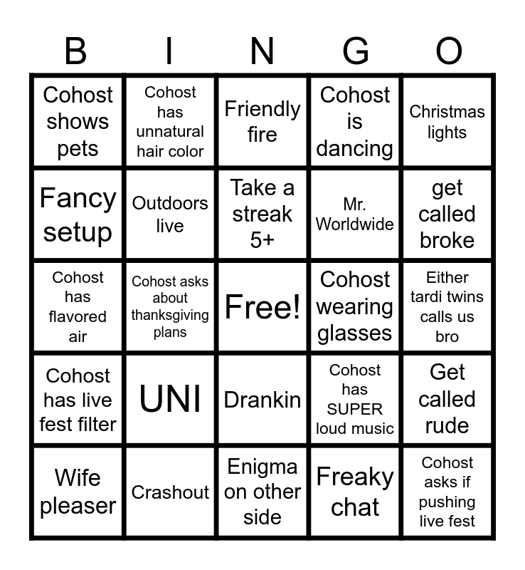 This bingo card has a free space and 24 words: UNI, Crashout, Take a streak 5+, Wife pleaser, Christmas lights, Cohost shows pets, Fancy setup, Cohost has unnatural hair color, Cohost wearing glasses, Drankin, Mr. Worldwide, Cohost has flavored air, Cohost has SUPER loud music, Get called rude, Outdoors live, Freaky chat, Either tardi twins calls us bro, Friendly fire, get called broke, Cohost asks about thanksgiving plans, Cohost asks if pushing live fest, Cohost has live fest filter, Cohost is dancing and Enigma on other side.