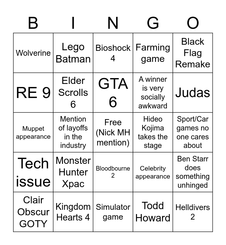This bingo card has a free space and 24 words: Monster Hunter Xpac, Kingdom Hearts 4, GTA 6, Clair Obscur GOTY, Black Flag Remake, Wolverine, RE 9, Lego Batman, Hideo Kojima takes the stage, Bloodbourne 2, A winner is very socially awkward, Muppet appearance, Celebrity appearance, Ben Starr does something unhinged, Elder Scrolls 6, Todd Howard, Sport/Car games no one cares about, Bioshock 4, Judas, Mention of layoffs in the industry, Helldivers 2, Tech issue, Farming game and Simulator game.