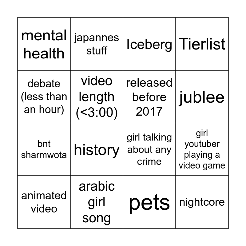 This bingo card has 16 words: animated video, arabic girl song, Iceberg, Tierlist, debate (less than an hour), japannes stuff, girl talking about any crime, girl youtuber playing a video game, mental health, video length (<3:00), pets, jublee, bnt sharmwota, history, released before 2017 and nightcore.
