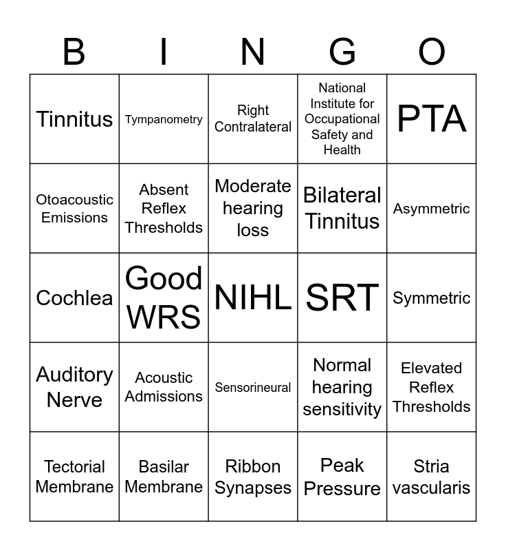 This bingo card has a free space and 54 words: Outer Hair Cells, Auditory Nerve, Cranial Nerve VIII, Spiral Ganglion Cells, Sensorineural, US Occupational Safety and Health Administration, National Institute for Occupational Safety and Health, Notch Configuration, Otoacoustic Emissions, Vertigo, Tinnitus, Hyperacusis, Basilar Membrane, Tectorial Membrane, Inner Hair Cells, Ribbon Synapses, Stria vascularis, Bilateral Tinnitus, Distorted Sound Quality, Symmetric, Normal hearing sensitivity, Mild hearing loss, SRT, PTA, Excellent WRS, Tympanometry, Type: A, Canal Volume, Admittance, Peak Pressure, Speech Audiometry, Acoustics Reflex Thresholds, Left Ipsilateral, Right Ipsilateral, Right Contralateral, Left Contralateral, Cochlea, Elevated Reflex Thresholds, Auditory Pathway, Absent Reflex Thresholds, Amplification, Hearing Aids, Hearing Protection, OAE, Acoustic Admissions, ABR, Speech in Noise Testing, High Frequency Sounds, Moderate hearing loss, Good WRS, Asymmetric, Left Ear, Right Ear and Ear Plugs.