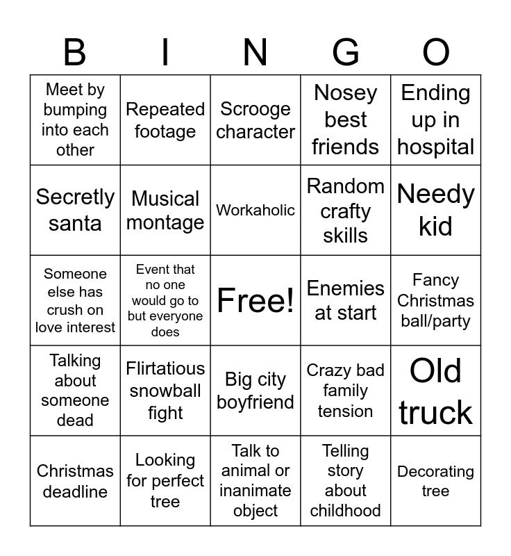 This bingo card has a free space and 29 words: Christmas deadline, Clearly illegal action that works out bc Christmas, Event that no one would go to but everyone does, Santa sighting, Meet by bumping into each other, Scrooge character, Musical montage, Flirtatious snowball fight, Enemies at start, Looking for perfect tree, Fancy Christmas ball/party, Decorating tree, Talk to animal or inanimate object, Telling story about childhood, Needy kid, Secretly royalty, Big city boyfriend, Talking about someone dead, Ending up in hospital, Someone else has crush on love interest, Crazy bad family tension, Someone learns meaning of Christmas, Random crafty skills, Secretly santa, Nosey best friends, Repeated footage, Old truck, Workaholic and Randomly starts snowing.
