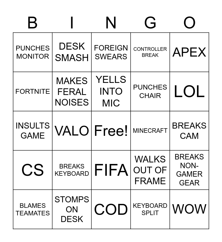 This bingo card has a free space and 24 words: BREAKS KEYBOARD, STOMPS ON DESK, YELLS INTO MIC, BLAMES TEAMATES, APEX, PUNCHES MONITOR, FORTNITE, DESK SMASH, MINECRAFT, FIFA, PUNCHES CHAIR, INSULTS GAME, WALKS OUT OF FRAME, BREAKS NON-GAMER GEAR, MAKES FERAL NOISES, KEYBOARD SPLIT, BREAKS CAM, FOREIGN SWEARS, LOL, VALO, WOW, CS, CONTROLLER BREAK and COD.