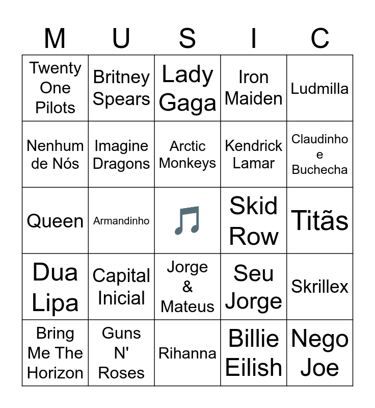 This bingo card has a free space and 50 words: Paralamas do Sucesso, Guns N' Roses, Red Hot Chili Peppers, Tim Maia, Titãs, Coldplay, Britney Spears, Madonna, Kendrick Lamar, Michael Jackson, Twenty One Pilots, Imagine Dragons, Rihanna, Billie Eilish, Bob Marley, Green Day, Armandinho, Arctic Monkeys, The Weeknd, Ludmilla, Queen, Shakira, Lady Gaga, Skid Row, Charlie Brown Jr., Dua Lipa, Capital Inicial, Jota Quest, Iron Maiden, Skrillex, Zeca Pagodinho, Jorge Aragão, Bon Jovi, SOJA, Maroon 5, Bring Me The Horizon, Bullet For My Valentine, MC Leozinho, Bonde do Tigrão, Claudinho e Buchecha, Marília Mendonça, Maiara & Maraísa, Jorge & Mateus, Gusttavo Lima, Nego Joe, Nenhum de Nós, Cidadão Quem, Djavan, Seu Jorge and Tom Jobim.