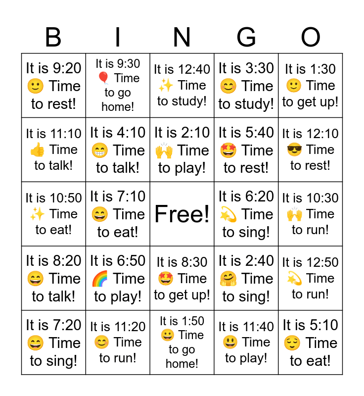 This bingo card has a free space and 30 words: It is 11:20 😊 Time to run!, It is 3:50 🤗 Time to play!, It is 7:10 😄 Time to eat!, It is 2:30 🌟 Time to read!, It is 9:20 🙂 Time to rest!, It is 12:40 ✨ Time to study!, It is 4:10 😁 Time to talk!, It is 8:30 🤩 Time to get up!, It is 6:20 💫 Time to sing!, It is 1:50 😀 Time to go home!, It is 10:30 🙌 Time to run!, It is 5:10 😌 Time to eat!, It is 11:40 😃 Time to play!, It is 3:20 🎉 Time to read!, It is 12:10 😎 Time to rest!, It is 7:50 😊 Time to study!, It is 2:40 🤗 Time to sing!, It is 8:20 😄 Time to talk!, It is 6:50 🌈 Time to play!, It is 1:30 🙂 Time to get up!, It is 10:50 ✨ Time to eat!, It is 4:20 😁 Time to read!, It is 9:30 🎈 Time to go home!, It is 5:40 🤩 Time to rest!, It is 11:10 👍 Time to talk!, It is 3:30 😊 Time to study!, It is 12:50 💫 Time to run!, It is 7:20 😄 Time to sing!, It is 2:10 🙌 Time to play! and It is 8:40 😌 Time to read!.