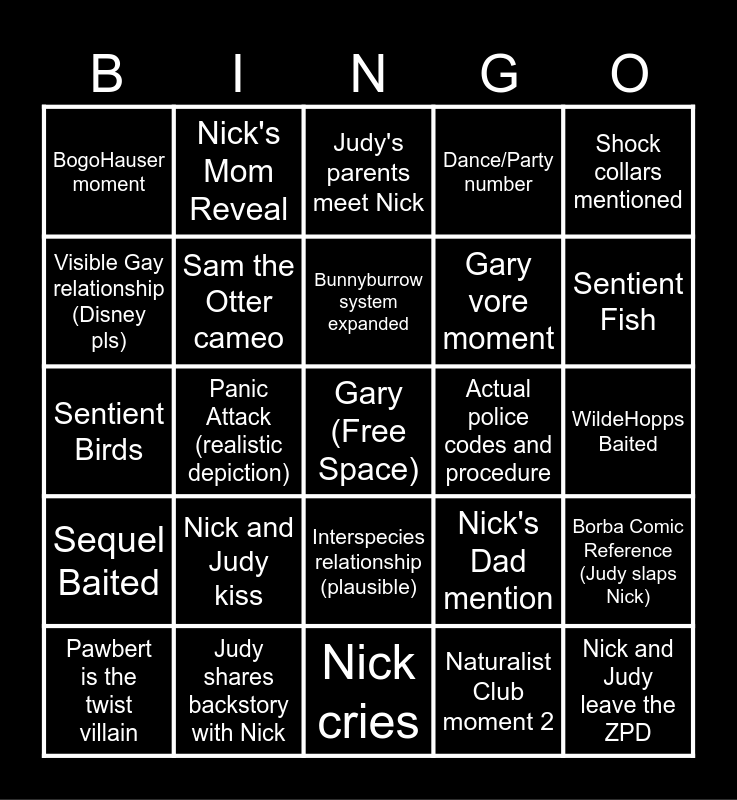 This bingo card has a free space and 24 words: Pawbert is the twist villain, Nick and Judy kiss, Bunnyburrow system expanded, Naturalist Club moment 2, Shock collars mentioned, BogoHauser moment, Nick's Mom Reveal, Judy's parents meet Nick, Actual police codes and procedure, WildeHopps Baited, Sentient Birds, Sam the Otter cameo, Nick's Dad mention, Borba Comic Reference (Judy slaps Nick), Visible Gay relationship (Disney pls), Judy shares backstory with Nick, Nick cries, Dance/Party number, Sentient Fish, Sequel Baited, Panic Attack (realistic depiction), Interspecies relationship (plausible), Gary vore moment and Nick and Judy leave the ZPD.