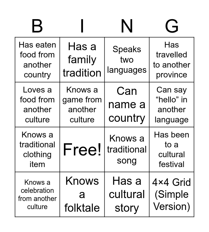 This bingo card has 18 words: Free!, 4×4 Grid (Simple Version), Speaks two languages, Has eaten food from another country, Knows a traditional song, Has travelled to another province, Knows a celebration from another culture, Has a family tradition, Can say “hello” in another language, Knows a traditional clothing item, Has a cultural story, Loves a food from another culture, Has been to a cultural festival, Knows a game from another culture, Can name a country, Knows a famous cultural symbol (Eiffel Tower, Ger…), Knows a folktale and Has a family member from another place.