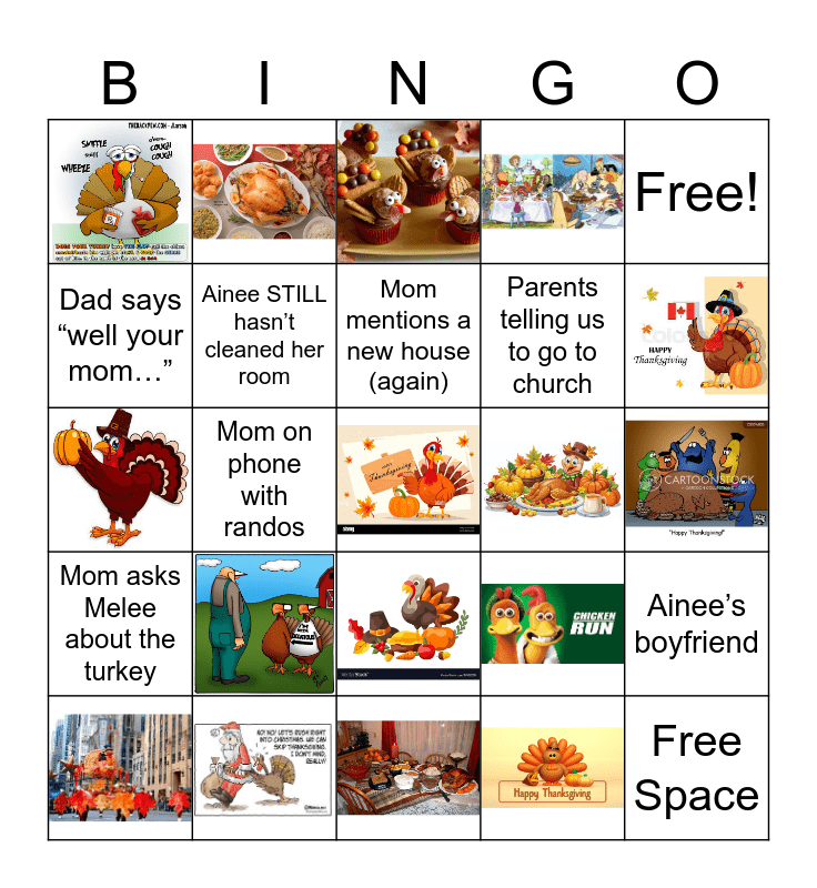 This bingo card has 28 images and 17 words: Free!, Mom asks Melee about the turkey, “No one told me/someone should’ve said something”, Ainee’s boyfriend, Baby, Not enough food/drink, “well Pheng/melee said…”, Mom on phone with randos, Mom has new Reno plans, Seufeun’s dating life, Free Space, Mom mentions a new house (again), Dad says “well your mom…”, Parents telling us to go to church, Dad does the prayer, Ainee STILL hasn’t cleaned her room and Hmong clothes pictures.