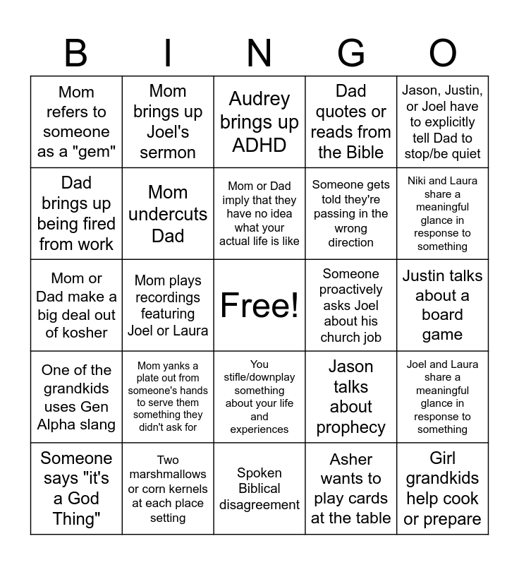 This bingo card has a free space and 24 words: Mom yanks a plate out from someone's hands to serve them something they didn't ask for, Two marshmallows or corn kernels at each place setting, Mom or Dad imply that they have no idea what your actual life is like, Someone says "it's a God Thing", Jason, Justin, or Joel have to explicitly tell Dad to stop/be quiet, Mom refers to someone as a "gem", Dad brings up being fired from work, Mom brings up Joel's sermon, Someone proactively asks Joel about his church job, You stifle/downplay something about your life and experiences, Someone gets told they're passing in the wrong direction, Mom or Dad make a big deal out of kosher, Jason talks about prophecy, Joel and Laura share a meaningful glance in response to something, Mom undercuts Dad, Asher wants to play cards at the table, Justin talks about a board game, Audrey brings up ADHD, Niki and Laura share a meaningful glance in response to something, Mom plays recordings featuring Joel or Laura, Girl grandkids help cook or prepare, One of the grandkids uses Gen Alpha slang, Dad quotes or reads from the Bible and Spoken Biblical disagreement.
