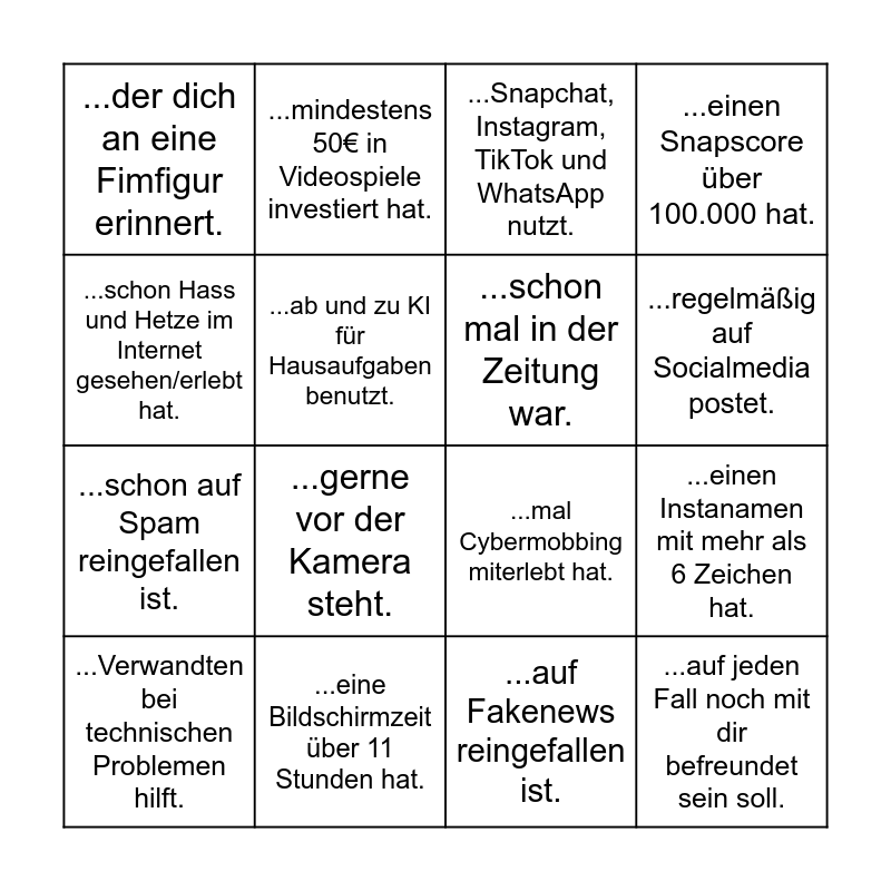This bingo card has 16 words: ...eine Bildschirmzeit über 11 Stunden hat., ...einen Instanamen mit mehr als 6 Zeichen hat., ...Snapchat, Instagram, TikTok und WhatsApp nutzt., ...der dich an eine Fimfigur erinnert., ...schon auf Spam reingefallen ist., ...mindestens 50€ in Videospiele investiert hat., ...mal Cybermobbing miterlebt hat., ...auf Fakenews reingefallen ist., ...schon Hass und Hetze im Internet gesehen/erlebt hat., ...ab und zu KI für Hausaufgaben benutzt., ...Verwandten bei technischen Problemen hilft., ...einen Snapscore über 100.000 hat., ...gerne vor der Kamera steht., ...regelmäßig auf Socialmedia postet., ...schon mal in der Zeitung war. and ...auf jeden Fall noch mit dir befreundet sein soll..