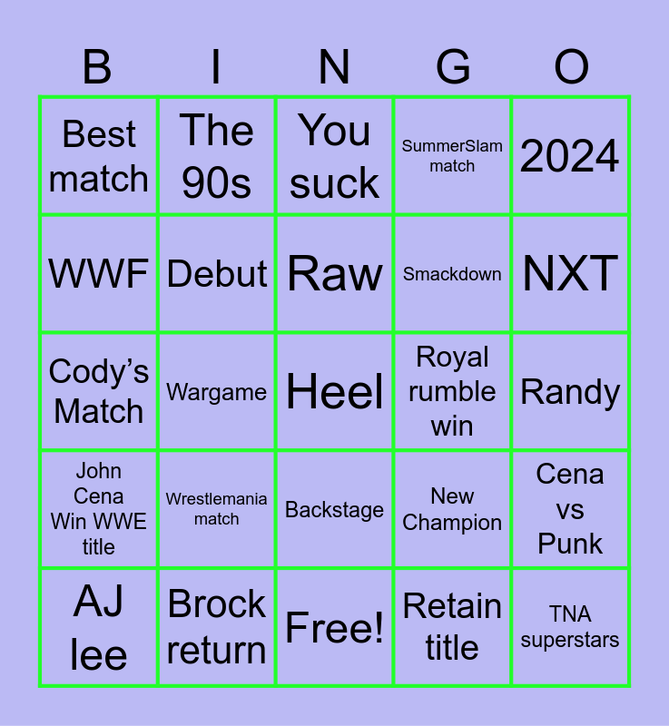 This bingo card has 25 words: John Cena Win WWE title, Brock return, Heel, Retain title, 2024, Best match, The 90s, You suck, Royal rumble win, Cena vs Punk, WWF, Debut, Free!, New Champion, NXT, AJ lee, Wargame, Raw, Smackdown, Randy, Cody’s Match, Wrestlemania match, Backstage, SummerSlam match and TNA superstars.