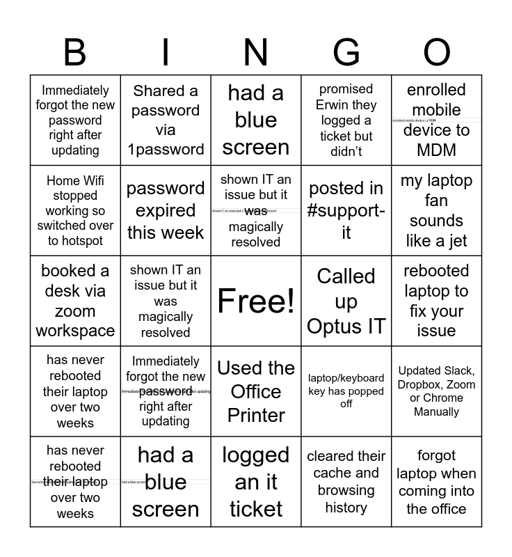 This bingo card has 5 images, a free space and 24 words: Immediately forgot the new password right after updating, had a blue screen, shown IT an issue but it was magically resolved, has never rebooted their laptop over two weeks, enrolled mobile device to MDM, Immediately forgot the new password right after updating, Home Wifi stopped working so switched over to hotspot, Shared a password via 1password, Called up Optus IT, Used the Office Printer, posted in #support-it, booked a desk via zoom workspace, laptop/keyboard key has popped off, Updated Slack, Dropbox, Zoom or Chrome Manually, password expired this week, cleared their cache and browsing history, rebooted laptop to fix your issue, had a blue screen, my laptop fan sounds like a jet, shown IT an issue but it was magically resolved, forgot laptop when coming into the office, has never rebooted their laptop over two weeks, promised Erwin they logged a ticket but didn’t and logged an it ticket.