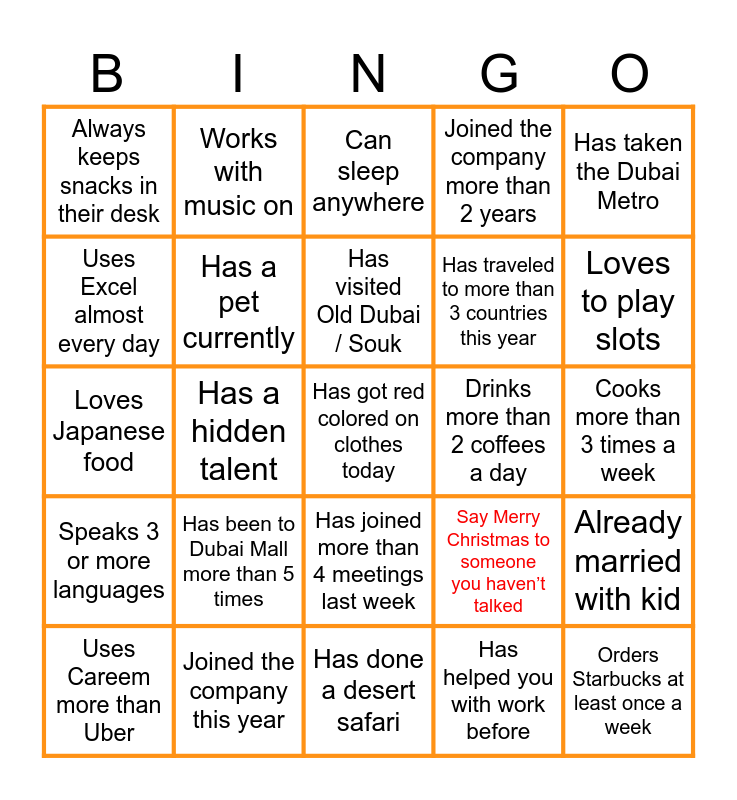 This bingo card has 25 words: Has been to Dubai Mall more than 5 times, Has done a desert safari, Has visited Old Dubai / Souk, Uses Careem more than Uber, Has taken the Dubai Metro, Always keeps snacks in their desk, Uses Excel almost every day, Works with music on, Drinks more than 2 coffees a day, Has joined more than 4 meetings last week, Has traveled to more than 3 countries this year, Loves Japanese food, Say Merry Christmas to someone you haven’t talked, Already married with kid, Has a pet currently, Orders Starbucks at least once a week, Cooks more than 3 times a week, Can sleep anywhere, Loves to play slots, Has a hidden talent, Has got red colored on clothes today, Joined the company this year, Speaks 3 or more languages, Joined the company more than 2 years and Has helped you with work before.