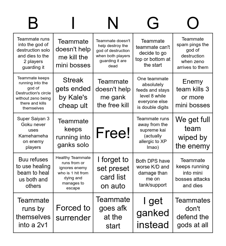 This bingo card has a free space and 24 words: Teammate runs by themselves into a 2v1, Healthy Teammate runs from or ignores enemy who is 1 hit from dying and manages to escape, Teammate doesn't help me gank the free kill, I get ganked instead, Teammate spam pings the god of destruction when zeno arrives to them, Teammate runs into the god of destruction solo and dies to the 2 players guarding it, Teammate doesn't help me kill the mini bosses, Teammate doesn't help destroy the god of destruction when both players guarding it are dead, Teammate runs away from the supreme kai (actually allergic to XP lmao), We get full team wiped by the enemy, Super Saiyan 3 Goku never uses Kamehameha on enemy players, Streak gets ended by Kale's cheap ult, Both DPS have worse K/D and damage than me on tank/support, Teammate keeps running into mini bosses attacks and dies, Teammate keeps running into the god of Destruction's circle without zeno being there and kills themselves, Forced to surrender, Teammate goes afk at the start, Teammate teammate can't decide to go top or bottom at the start, Enemy team kills 3 or more mini bosses, Buu refuses to use healing beam to heal us both and others, Teammate keeps running into ganks solo, I forget to set preset card list on auto, One teammate absolutely feeds and stays level 8 while everyone else is double digits and Teammates don't defend the gods at all.