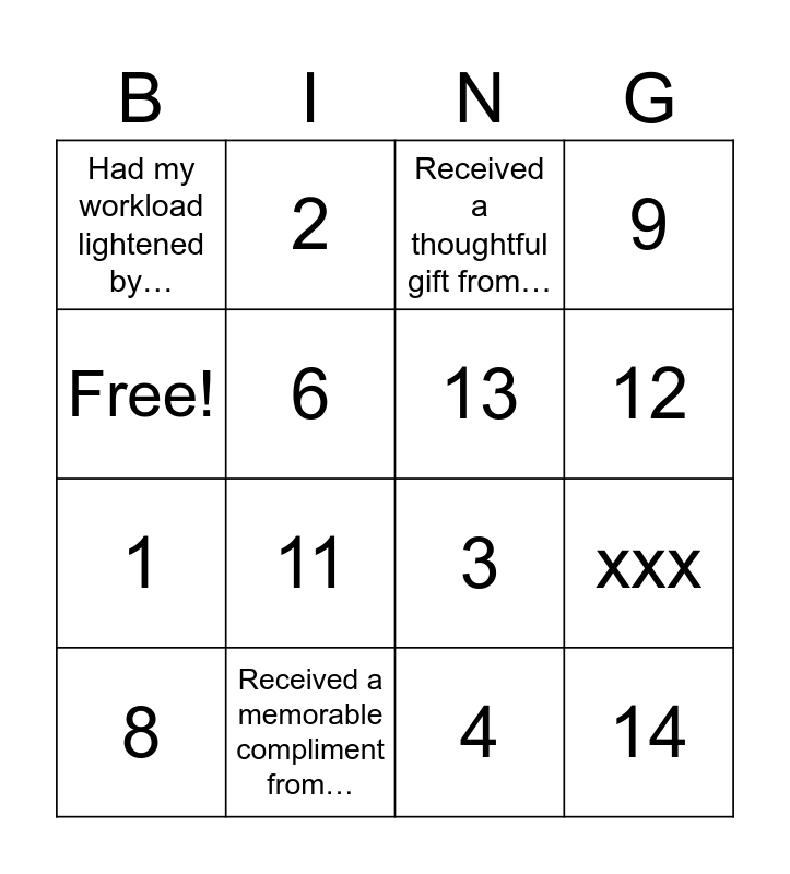 This bingo card has 16 words: Received a memorable compliment from…, xxx, Received a thoughtful gift from…, Had my workload lightened by…, 1, 2, 3, 4, Free!, 6, 8, 9, 11, 12, 13 and 14.