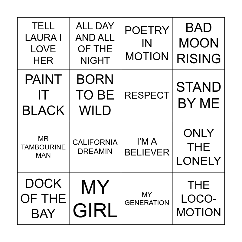 This bingo card has 30 words: IT'S NOW OR NEVER, THE TWIST, ONLY THE LONELY, BEYOND THE SEA, TELL LAURA I LOVE HER, POETRY IN MOTION, RESPECT, HEY JUDE, MY GIRL, YOU REALLY GOT ME, MY GENERATION, DOCK OF THE BAY, I GET AROUND, OH PRETTY WOMAN, CALIFORNIA DREAMIN, GLAD ALL OVER, WILD THING, THE LOCO-MOTION, RUNAROUND SUE, PAINT IT BLACK, I'M A BELIEVER, STRAWBERRY FIELDS, ALL DAY AND ALL OF THE NIGHT, MR TAMBOURINE MAN, BORN TO BE WILD, BAD MOON RISING, THE WANDERER, SURFIN USA, STAND BY ME and HONKY TONK WOMEN.
