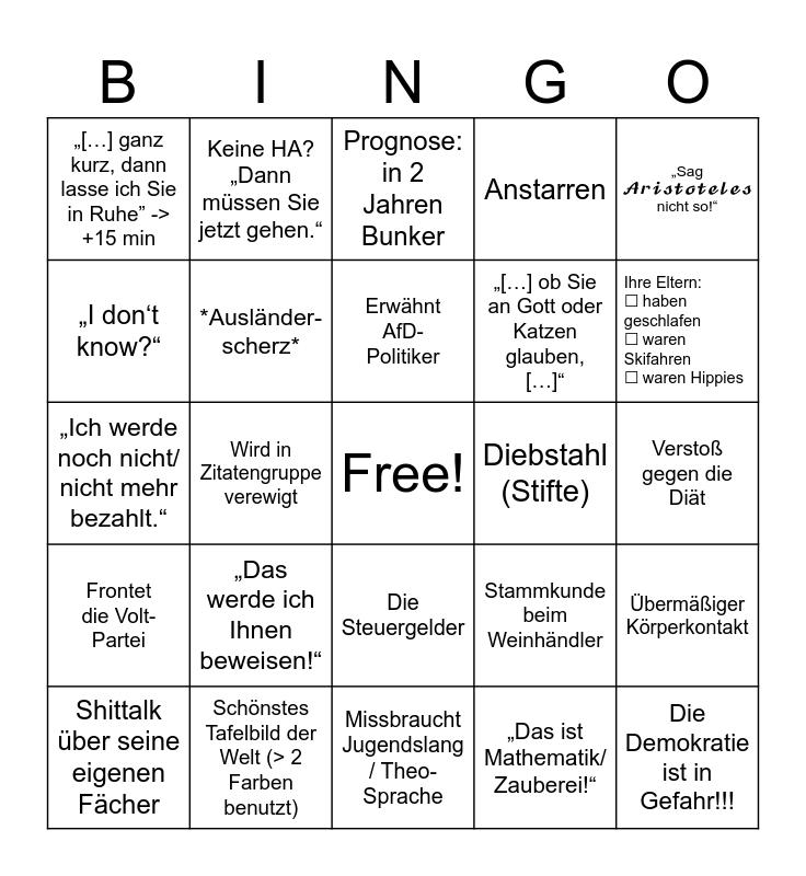 This bingo card has a free space and 30 words: Schönstes Tafelbild der Welt (> 2 Farben benutzt), Lästert über Kollegen, Wird in Zitatengruppe verewigt, Simulierte Beziehungs-dramen, „[…] ganz kurz, dann lasse ich Sie in Ruhe” -> +15 min, Prognose: in 2 Jahren Bunker, *Ausländer-scherz*, Die Steuergelder, Diebstahl (Stifte), Missbraucht Jugendslang / Theo-Sprache, Verstoß gegen die Diät, Die Demokratie ist in Gefahr!!!, „Das ist Mathematik/ Zauberei!“, „Was weiß ich, wer bin ich?“, Ihre Eltern: ☐ haben geschlafen ☐ waren Skifahren ☐ waren Hippies, Bittere Verspätungen (> 5 oder Aldudak selbst), Stammkunde beim Weinhändler, Frontet die Volt-Partei, „Das werde ich Ihnen beweisen!“, „Sag 𝓐𝓻𝓲𝓼𝓽𝓸𝓽𝓮𝓵𝓮𝓼 nicht so!“, „Ich werde noch nicht/ nicht mehr bezahlt.“, Benutzt Vornamen statt ‚Frau/Herr [Nachname], Keine HA? „Dann müssen Sie jetzt gehen.“, „[…] ob Sie an Gott oder Katzen glauben, […]“, „I don‘t know?“, Anstarren, Übermäßiger Körperkontakt, Shittalk über seine eigenen Fächer, Erwähnt AfD-Politiker and „Er/Sie sagt das, nicht ich“.
