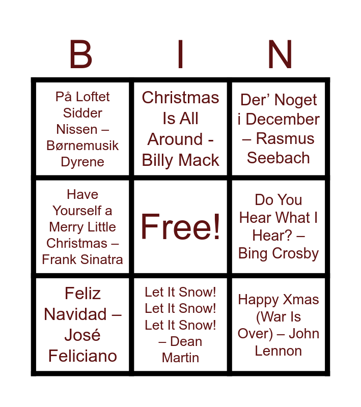 This bingo card has a free space and 41 words: All I Want for Christmas Is You – Mariah Carey, Last Christmas – Wham!, White Christmas – Bing Crosby, Feliz Navidad – José Feliciano, Rockin’ Around the Christmas Tree – Brenda Lee, It’s the Most Wonderful Time of the Year – Andy Williams, Let It Snow! Let It Snow! Let It Snow! – Dean Martin, Jingle Bell Rock – Bobby Helms, Happy Xmas (War Is Over) – John Lennon, Santa Tell Me – Ariana Grande, Driving Home for Christmas – Chris Rea, Have Yourself a Merry Little Christmas – Frank Sinatra, Merry Christmas Everyone – Shakin’ Stevens, Wonderful Christmastime – Paul McCartney, It’s Beginning to Look a Lot Like Christmas – Michael Bublé, Jul På Vesterbro – Anders Matthesen, Jul i Angora – Drengene fra Angora, På Loftet Sidder Nissen – Børnemusik Dyrene, Jul i Krummeland – Krummernes Jul, Der’ Noget i December – Rasmus Seebach, Blue Christmas – Elvis Presley, Jeg Så Julemanden Kysse Mor – Paprika Steen, The Christmas Song – Nat King Cole, Someday At Christmas – Stevie Wonder, O Holy Night – Céline Dion, Underneath the Tree – Kelly Clarkson, Do They Know It’s Christmas? – Band Aid, Fairytale of New York – The Pogues feat. Kirsty MacColl, Santa Baby - Ariana Grande, Misteltoe - Justin Bieber, Step Into Christmas - Elton John, Christmas Is All Around - Billy Mack, Baby it’s Cold Outside - Rick Reuther, Sleigh Ride - Leroy Anderson, Winter Wonderland - Northmen, Do You Hear What I Hear? – Bing Crosby, Rudolph the Red-Nosed Reindeer – Gene Autry, Snowman - Sia, Run, Run, Rudolph - Patrick Carpenter, Noël Noël - El Canfin and Frosty The Snowman - Bing Crosby.
