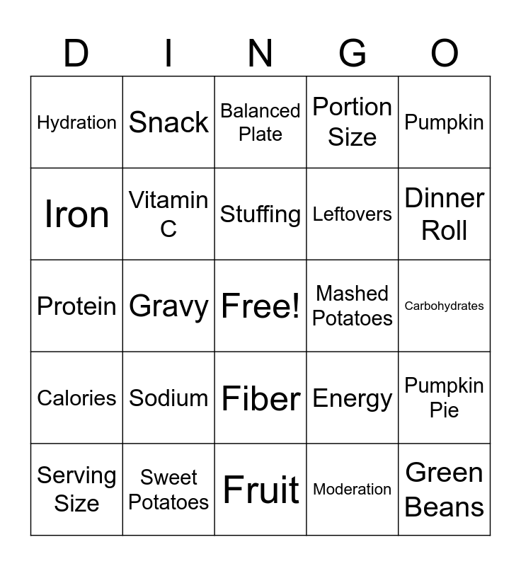This bingo card has a free space and 40 words: Turkey, Protein, Cranberries, Vitamin C, Sweet Potatoes, Fiber, Stuffing, Whole Grains, Pumpkin, Calories, Gravy, Portion Size, Green Beans, Carbohydrates, Mashed Potatoes, Sodium, Cornbread, Hydration, Apples, Balanced Plate, Pumpkin Pie, Moderation, Leftovers, Iron, Corn, Nutrients, Roasted Vegetables, Fat, Homemade, Harvest, Food Safety, Serving Size, Salad, Energy, Dinner Roll, Fruit, Vegetable, Plate Method, Snack and Thanksgiving Feast.