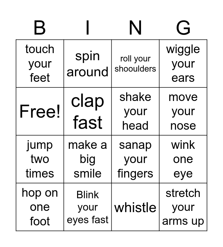 This bingo card has 16 words: Blink your eyes fast, wink one eye, roll your shooulders, touch your feet, jump two times, spin around, sanap your fingers, whistle, Free!, clap fast, hop on one foot, wiggle your ears, make a big smile, move your nose, shake your head and stretch your arms up.