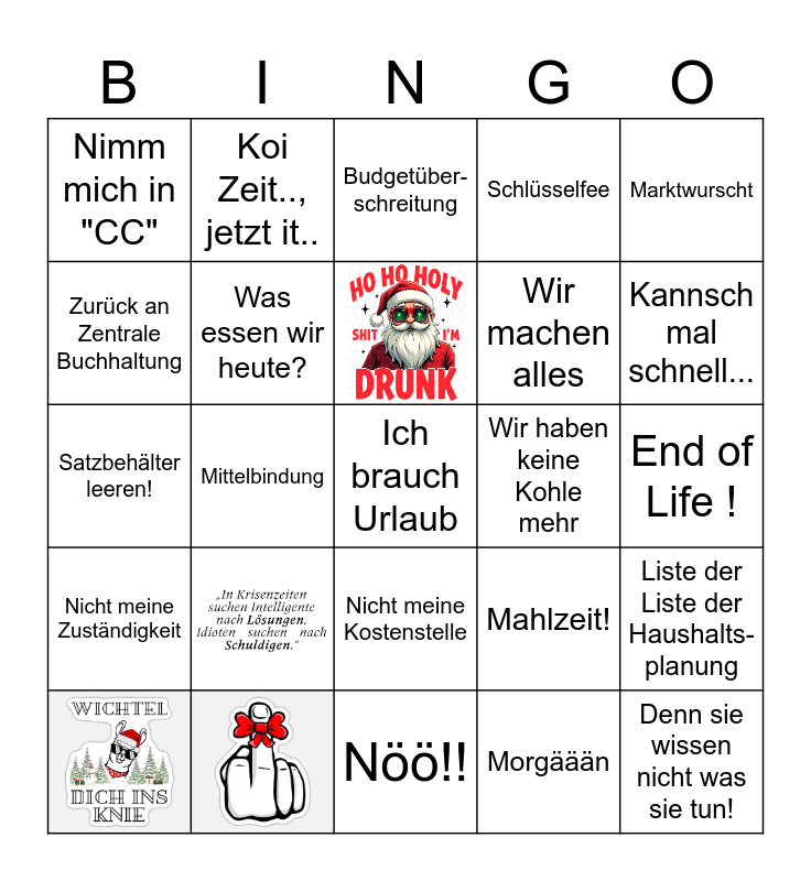 This bingo card has 4 images, a free space and 20 words: Marktwurscht, Nimm mich in "CC", Zurück an Zentrale Buchhaltung, Koi Zeit.., jetzt it.., Wir haben keine Kohle mehr, Nicht meine Kostenstelle, Wir machen alles, Satzbehälter leeren!, Mahlzeit!, Liste der Liste der Haushalts- planung, Was essen wir heute?, Morgäään, End of Life !, Budgetüber- schreitung, Kannsch mal schnell..., Mittelbindung, Denn sie wissen nicht was sie tun!, Nicht meine Zuständigkeit, Schlüsselfee and Nöö!!.