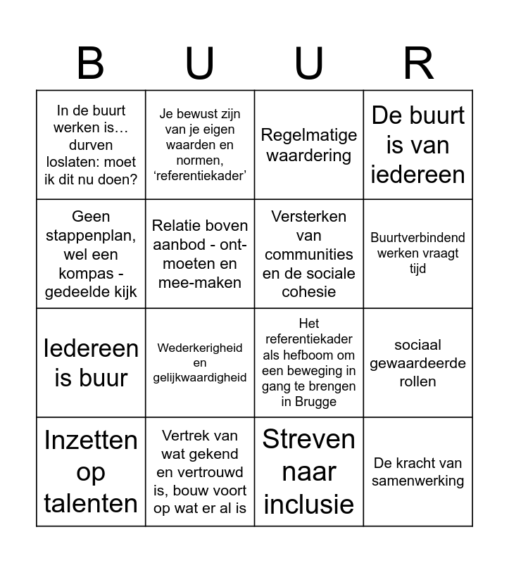 This bingo card has 25 words: Elke buurt is anders, Laagdrempelige ontmoetingen op verbindende plekken, Buurtverbindend werken vraagt tijd, Ideaal: een stad die zich op alle terreinen, levensdomeinen en facetten op buurtschaal organiseert. Eigenaarschap in de buurt!, Geen stappenplan, wel een kompas - gedeelde kijk, In de buurt werken is… durven loslaten: moet ik dit nu doen?, Relatie boven aanbod - ont-moeten en mee-maken, Je bewust zijn van je eigen waarden en normen, ‘referentiekader’, Vertrek van wat gekend en vertrouwd is, bouw voort op wat er al is, Het streven naar een duurzaam systeem van ondersteuning voor elke buur, Iedereen is buur, Het referentiekader als hefboom om een beweging in gang te brengen in Brugge, Burenhulp = wederkerig, informeel en vrijblijvend, niet iets dat ‘moet’, Bewust Bewegen in de Buurt, Versterken van communities en de sociale cohesie, Buurtverbindend werken gaat verder dan enkel voor je eigen cliënten en vanuit dienstverlening kijken, Streven naar inclusie, Regelmatige waardering, Wederkerigheid en gelijkwaardigheid, sociaal gewaardeerde rollen, Inzetten op talenten, Gedeelde verantwoordelijkheid, De kracht van samenwerking, De buurt is van iedereen and Begin klein en haalbaar.