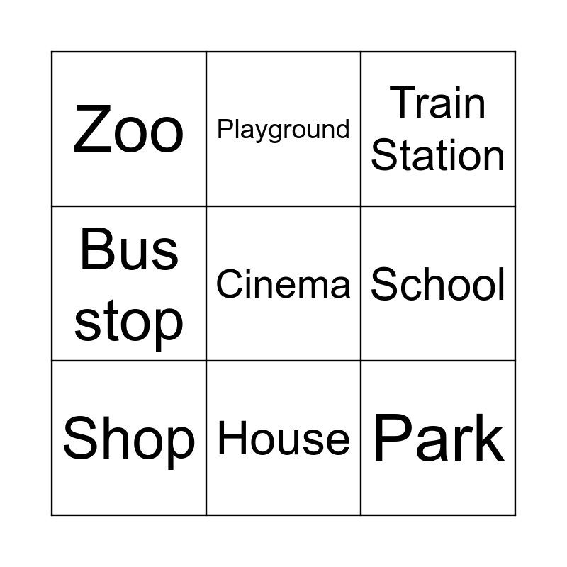 This bingo card has 13 words: Café, Hospital, Shop, Playground, Bus stop, Cinema, Park, Swimming Pool, House, Zoo, School, Train Station and Street.