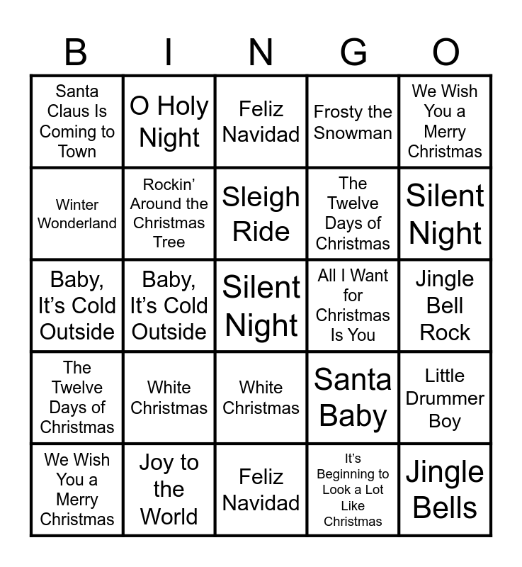 ⚠ This card has duplicate items: Jingle Bells (2), Silent Night (2), Last Christmas (2), Feliz Navidad (2), White Christmas (2), Deck the Halls (2), O Holy Night (2), Rudolph the Red-Nosed Reindeer (2), Winter Wonderland (2), Joy to the World (2), Rockin’ Around the Christmas Tree (2), Frosty the Snowman (2), Little Drummer Boy (2), Santa Baby (2), Jingle Bell Rock (2), Have Yourself a Merry Little Christmas (2), Sleigh Ride (2), All I Want for Christmas Is You (2), Carol of the Bells (2), We Wish You a Merry Christmas (2), Baby, It’s Cold Outside (2), It’s Beginning to Look a Lot Like Christmas (2), Santa Claus Is Coming to Town (2), The Twelve Days of Christmas (2), Let It Snow! Let It Snow! Let It Snow! (2)