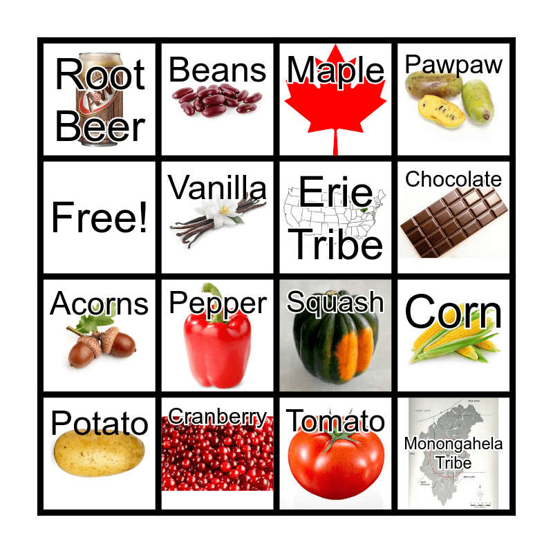 This bingo card has 15 images and 16 words: Cranberry, Corn, Maple, Root Beer, Acorns, Beans, Squash, Tomato, Free!, Vanilla, Potato, Pawpaw, Pepper, Chocolate, Erie Tribe and Monongahela Tribe.