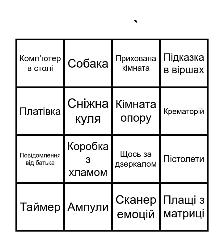 This bingo card has 16 words: Ампули, Пістолети, Прихована кімната, Компʼютер в столі, Повідомлення від батька, Собака, Щось за дзеркалом, Сканер емоцій, Платівка, Сніжна куля, Таймер, Підказка в віршах, Коробка з хламом, Крематорій, Кімната опору and Плащі з матриці.