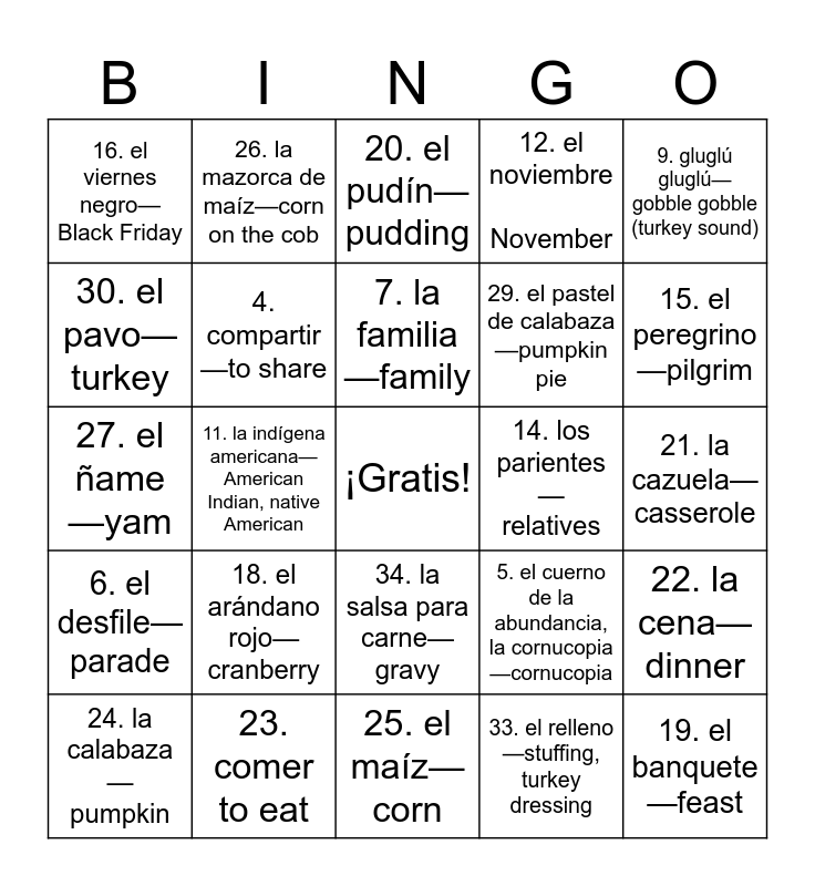 This bingo card has a free space and 36 words: 1. agradecido (por)—thankful (for), 2. ciberlunes—Cyber Monday, 3. la colonia—colony, 4. compartir—to share, 5. el cuerno de la abundancia, la cornucopia—cornucopia, 6. el desfile—parade, 7. la familia—family, 8. el fútbol americano—football (not soccer), 9. gluglú gluglú—gobble gobble (turkey sound), 10. las gracias—thanks, 11. la indígena americana—American Indian, native American, 12. el noviembre November, 13. el otoño— fall, 14. los parientes—relatives, 15. el peregrino—pilgrim, 16. el viernes negro—Black Friday, 17. Comida - food, 18. el arándano rojo—cranberry, 19. el banquete—feast, 20. el pudín—pudding, 21. la cazuela—casserole, 22. la cena—dinner, 23. comer to eat, 24. la calabaza —pumpkin, 25. el maíz—corn, 26. la mazorca de maíz—corn on the cob, 27. el ñame—yam, 28. el panecillo—dinner roll, 29. el pastel de calabaza—pumpkin pie, 30. el pavo—turkey, 31. el pavo asado—roast turkey, 32. el puré de patatas—mashed potatoes, 33. el relleno—stuffing, turkey dressing, 34. la salsa para carne—gravy, 35. los restos—leftovers and 36. las verduras—vegetables.