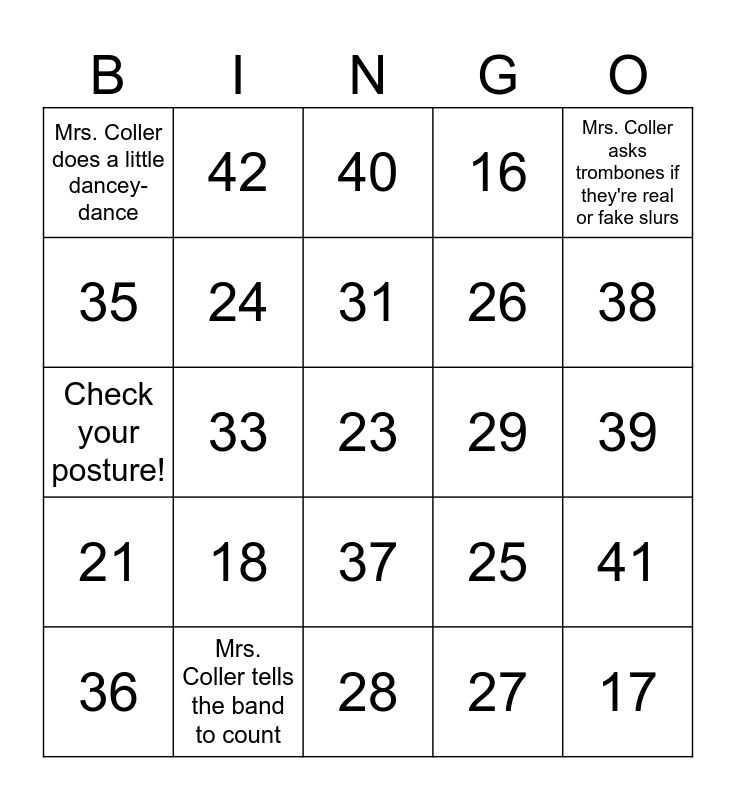 This bingo card has 28 words: 41, 30, 26, 27, 35, 40, 42, 21, 29, 36, Check your posture!, 16, Mrs. Coller tells the band to count, 28, 38, Mrs. Coller waits for quiet to begin, 18, 24, 31, 37, Mrs. Coller does a little dancey- dance, 17, 23, 33, 39, 25, Mrs. Coller asks trombones if they're real or fake slurs and Mrs. Coller says "instruments up".