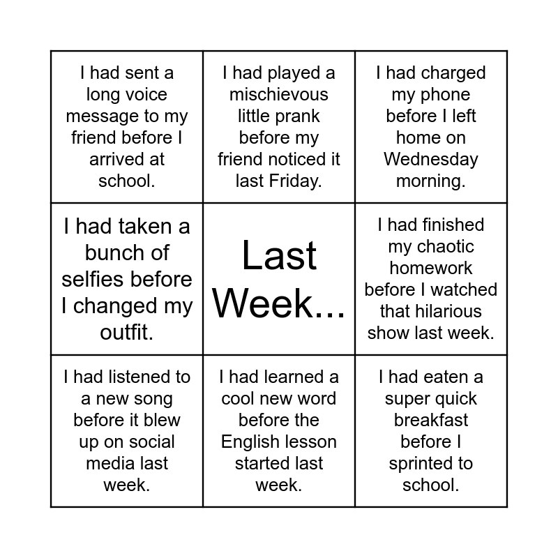 This bingo card has a free space and 8 words: I had finished my chaotic homework before I watched that hilarious show last week., I had charged my phone before I left home on Wednesday morning., I had played a mischievous little prank before my friend noticed it last Friday., I had listened to a new song before it blew up on social media last week., I had sent a long voice message to my friend before I arrived at school., I had eaten a super quick breakfast before I sprinted to school., I had taken a bunch of selfies before I changed my outfit. and I had learned a cool new word before the English lesson started last week..