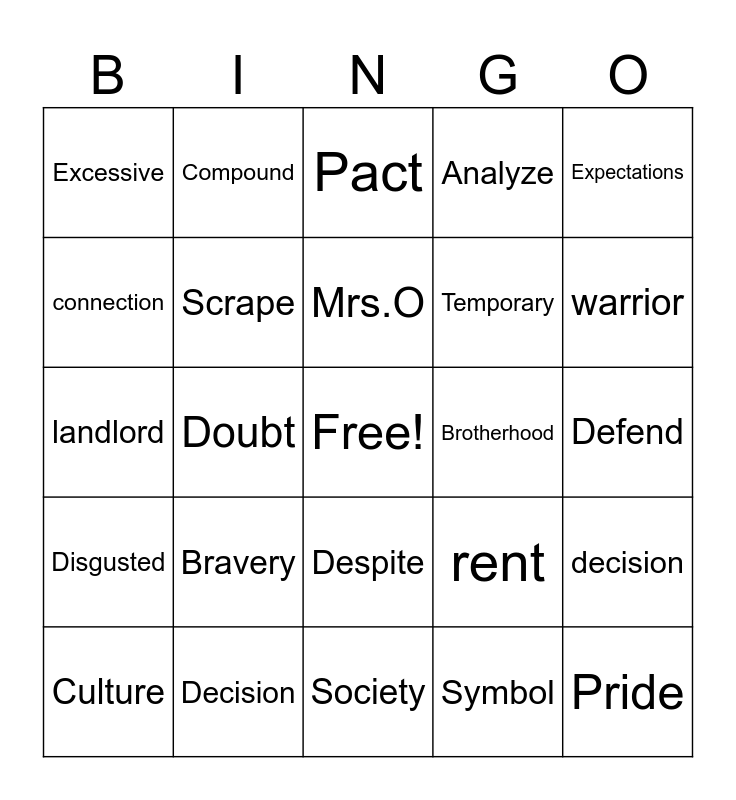 This bingo card has a free space and 29 words: Culture, Disfavor, Doubt, Erase, Excessive, Pact, Scrape, Bravery, Brotherhood, Decision, Defend, Pride, Society, Symbol, warrior, Appreciate, Despite, Disgusted, Expectations, landlord, rent, Strength, Temporary, connection, Analyze, Compound, decision, Mrs.O and Pickering Middle School.
