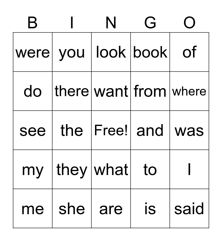 This bingo card has a free space and 24 words: they, she, want, me, of, were, do, you, and, what, from, see, to, I, there, is, was, look, where, the, said, my, book and are.