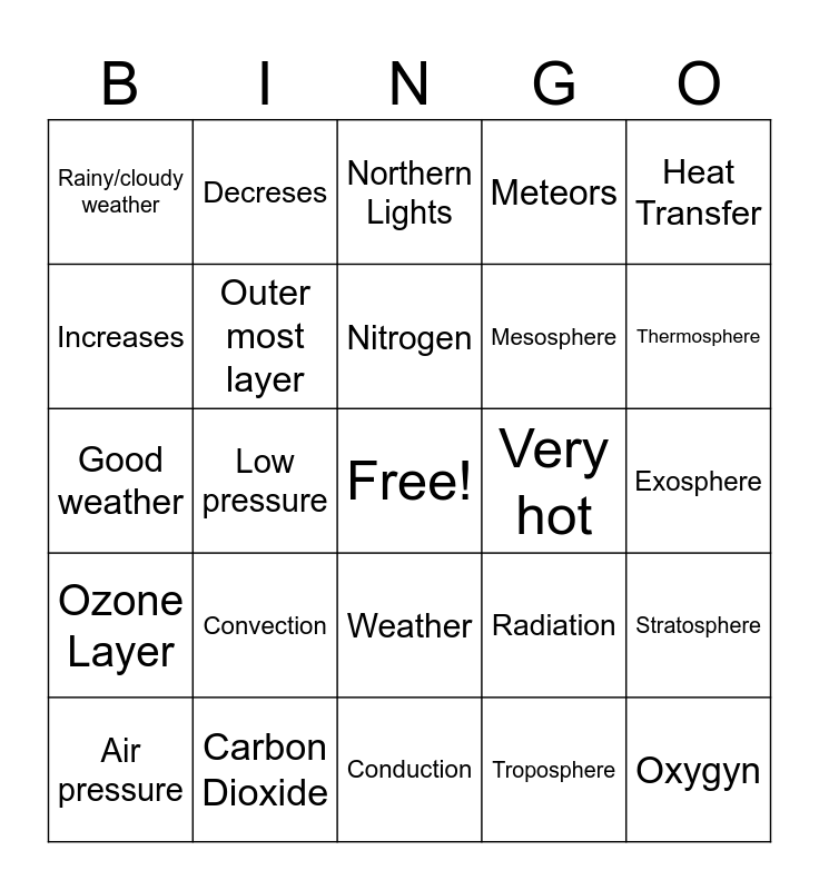 This bingo card has a free space and 24 words: Convection, Carbon Dioxide, Nitrogen, Air pressure, Heat Transfer, Rainy/cloudy weather, Increases, Decreses, Very hot, Weather, Mesosphere, Good weather, Radiation, Stratosphere, Outer most layer, Troposphere, Exosphere, Northern Lights, Thermosphere, Low pressure, Oxygyn, Ozone Layer, Meteors and Conduction.