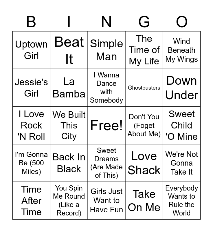 This bingo card has a free space and 32 words: Take On Me, Forever Young, We Built This City, I Want to Know What Love Is, I'm Gonna Be (500 Miles), La Bamba, Wind Beneath My Wings, We're Not Gonna Take It, Beat It, The Safety Dance, I Wanna Dance with Somebody, Simple Man, Don't Stop Believin', The Way You Make Me Feel, Don't You (Foget About Me), Pour Some Sugar On Me, Time After Time, I Love Rock 'N Roll, Sweet Dreams (Are Made of This), Back In Black, Love Shack, Livin' On a Prayer, Sweet Child 'O Mine, You Spin Me Round (Like a Record), Everybody Wants to Rule the World, The Time of My Life, Ghostbusters, Jessie's Girl, Uptown Girl, Girls Just Want to Have Fun, Smooth Criminal and Down Under.
